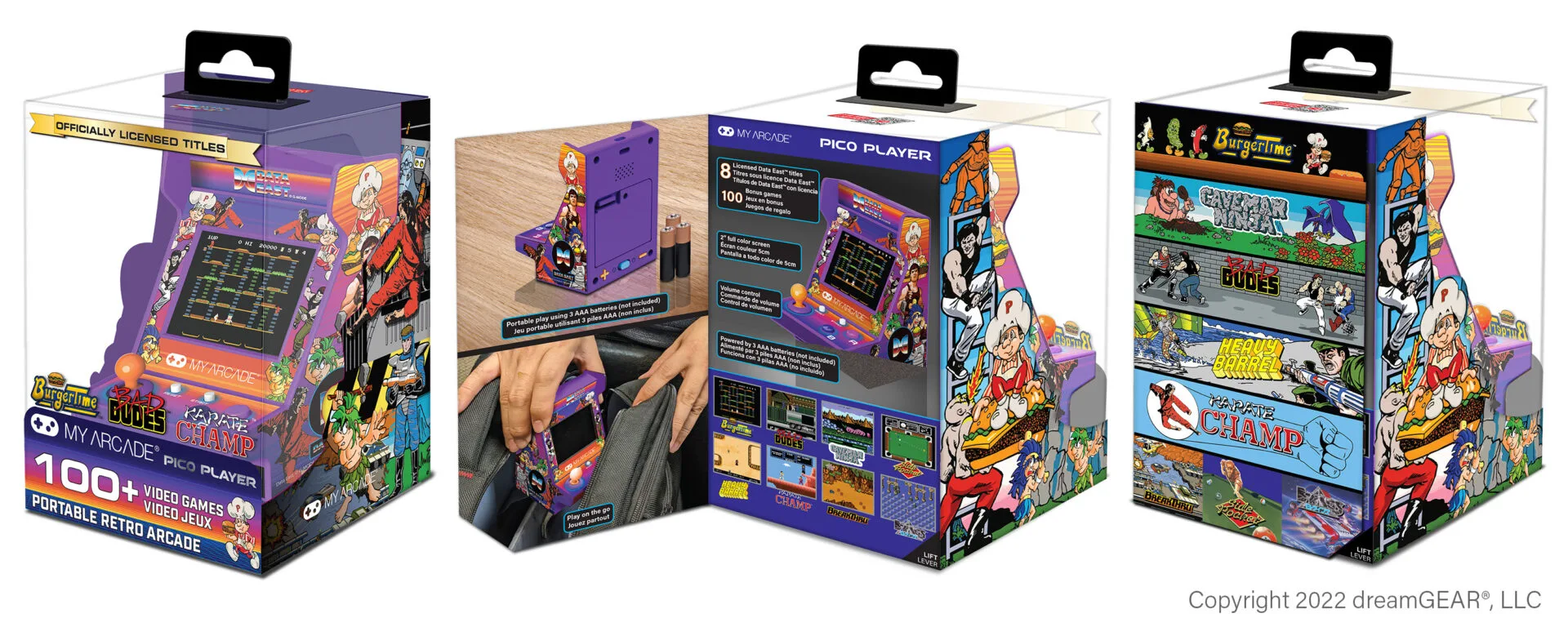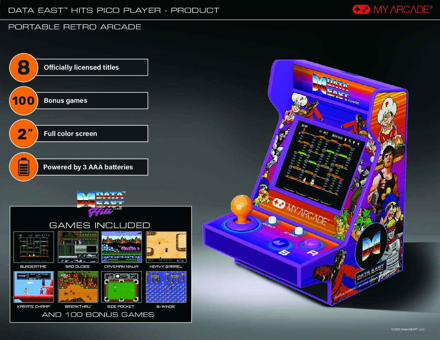 Collectible Pico Player packed full of memorable Data East™ titles. MY ARCADE® has teamed up with legendary game developer, Data East, to bring you some of your favorite Data East classics. From being armed with only a pepper shaker in BurgerTime™ to being a bad enough dude to rescue the President in Bad Dudes™, this Pico Player brings you back to a time where all you needed was a quarter. Real arcade graphics in the palm of your hand.