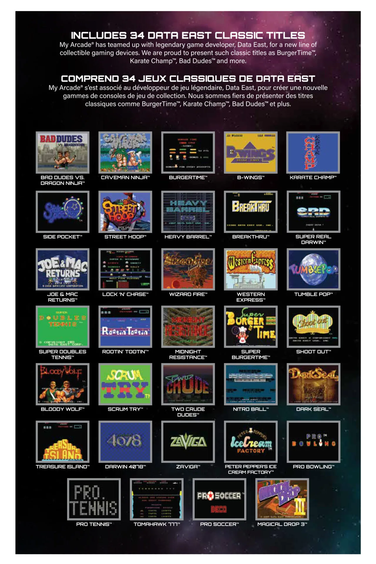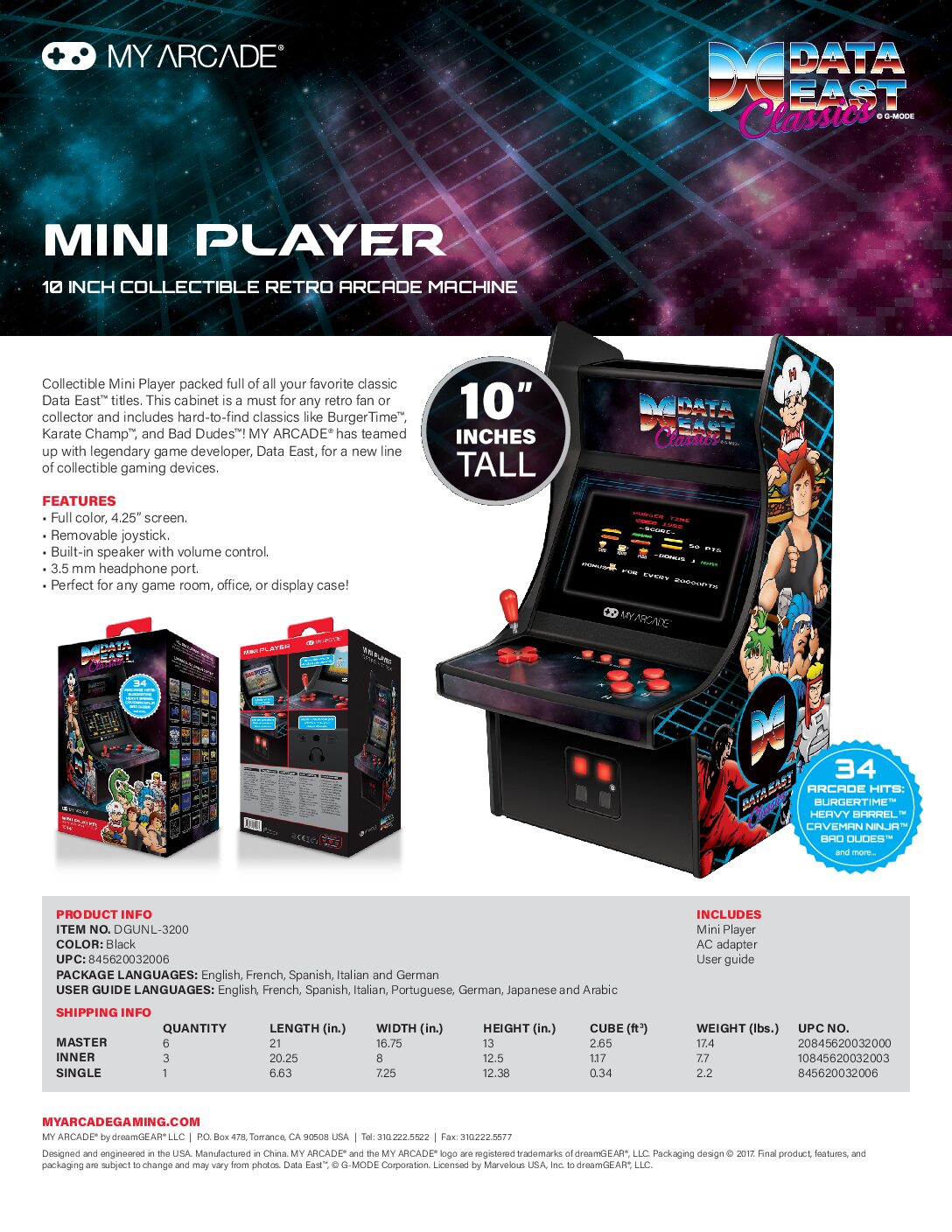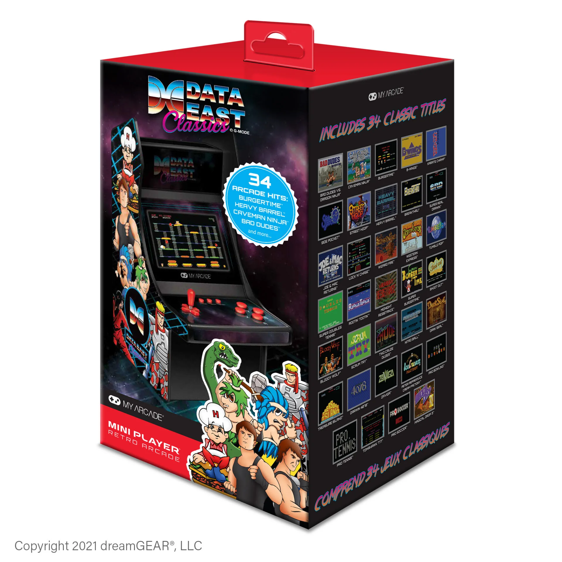 Data East Mini Collectible Mini Arcade Game packed full of all your favorite classic Data East™ titles. This cabinet is a must for any retro fan or collector and includes hard-to-find classics like BurgerTime™, Karate Champ™, and Bad Dudes™! MY ARCADE® has teamed up with legendary game developer, Data East, for a new line of collectible gaming devices.FEATURES• Full color, 4.25” screen. • Removable joystick.• Built-in speaker with volume control.• 3.5 mm headphone port.• Perfect for any game room, office, or display case
