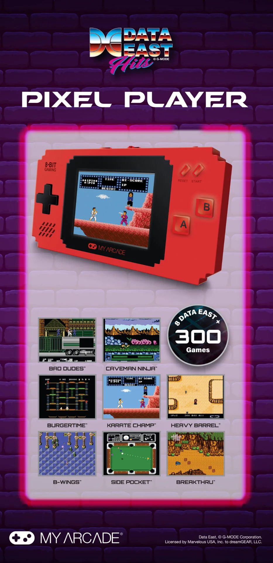 Portable gaming device with 300 built-in video games, including classic, beloved game titles from Data East® that you can’t find anywhere else, such as BurgerTime™, Karate Champ™ and Bad Dudes™
